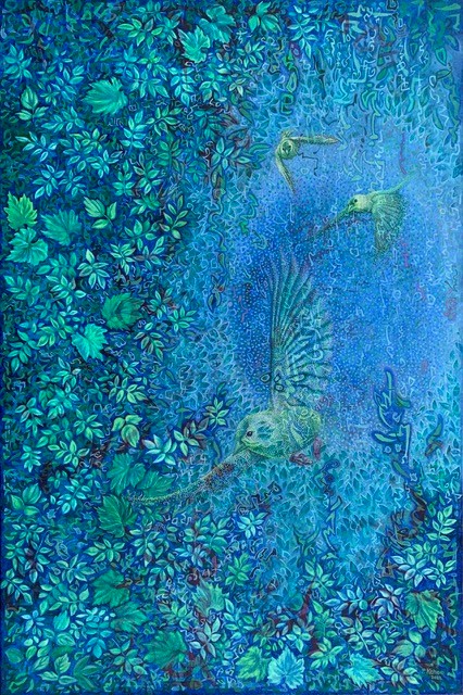 backgrounds. My intricate compositions are developed with layers of geometric pattern, intuitive shapes and rich colors. All together these elements evoke the complex and sublime order of the natural world.