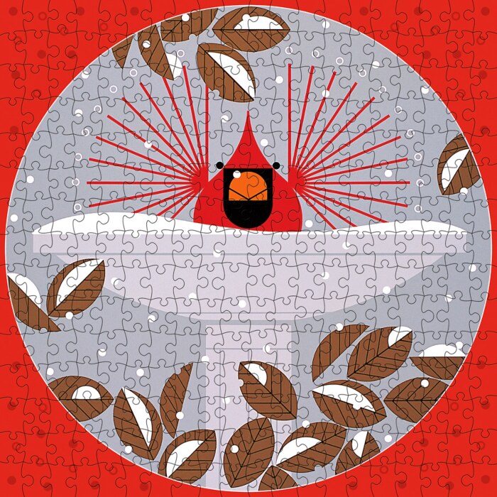 In typical Charley Harper fashion, the midcentury modern artist shows off his classic humor and minimal realist style, giving the bright cardinal an even brighter personality. Harper joked, how can he dry himself without a towel? Maybe freeze-dry? But you can snuggle up and enjoy B-r-r-r-r-rdbath with this cozy 300-piece puzzle.